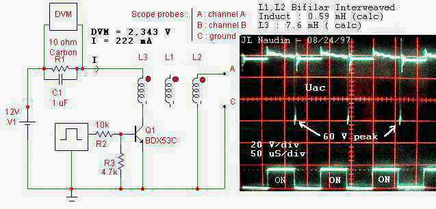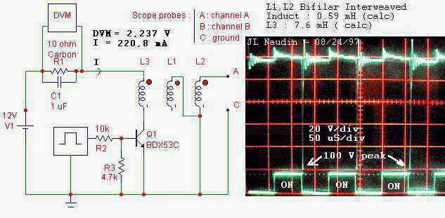 I have conducted some tests to understand better the working process in the TEP. The main goal of these series of tests is to understand better how a Bifilar coil works. I have used : - a BIFILAR coil L1,L2 ( interweaved ) which has a calculated inductance of 0.59 mH ( each ) The tested coils are switched through a transistor BDX53C by a square wave generator.. The signal is sent through a coil L3 ( wounded around the bifilar ). Calculated inductance : L3 = 7.6 mH