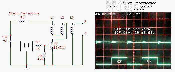 I have conducted some tests to understand better the working process in the TEP. The main goal of these series of tests is to compare Bifilar coils and Bucking coils for their inductive and Back EMF effects. I have used : - a BIFILAR coil L1,L2 ( interweaved ) which has a calculated inductance of 0.59 mH ( each ) - a BUCKING coil L1,L2 ( in serial ) which has a calculated inductance of 0.75 mH ( each ) The tested coils are switched through a transistor BDX53C by a square wave generator.. The inducted signal is received through a coil L3 ( wounded around the bifilar ). Calculated inductance : L3 = 7.6 mH