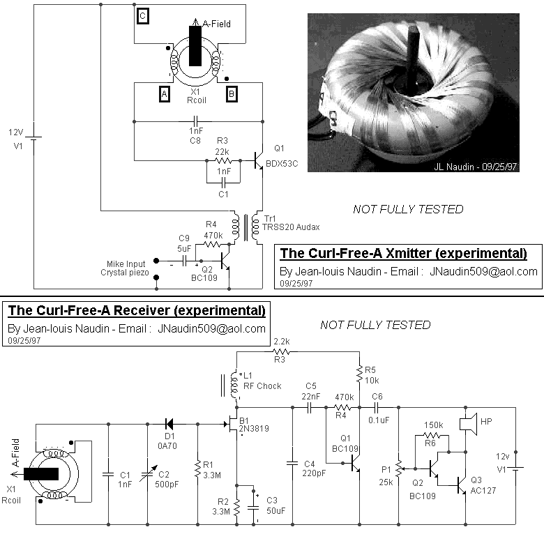 Notes from Jean-Louis Naudin : This device uses the "possible" emission of a curl-free-A potential which radiates from the Rodin coil both to its inside or center space and outside and beyond into space. The device is being under tests and I can't confirm this fact today. Also I give you this electronic diagram for your information and I take no responsiblity concerning the supposed characteristics ( Faster Than Ligh (FTL) transmissions, E.T. communications.......).