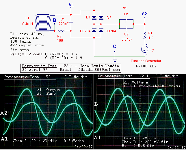 In this version the pump signal is injected on the bias point of the varactors (in the middle), you can notice the 90 degres phase shift between the signal pump and the output signal. In the right scope picture the output current is measured through the 100 ohms resistor (R2).